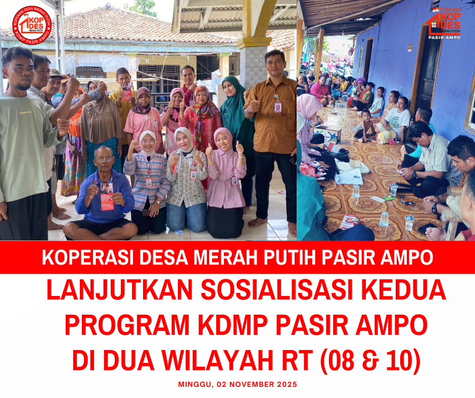PASIR AMPO, 02 November 2025 – Koperasi Desa Merah Putih Pasir Ampo melanjutkan rangkaian sosialisasi Program Koperasi Desa Merah Putih Pasir Ampo (KDMP) pada hari kedua, 02 November 2025 Kali ini, sosialisasi dilakukan secara spesifik dengan mendatangi wilayah Rukun Tetangga (RT) 008 dan RT 010 untuk menjaring aspirasi dan memperkuat pemahaman masyarakat akar rumput.